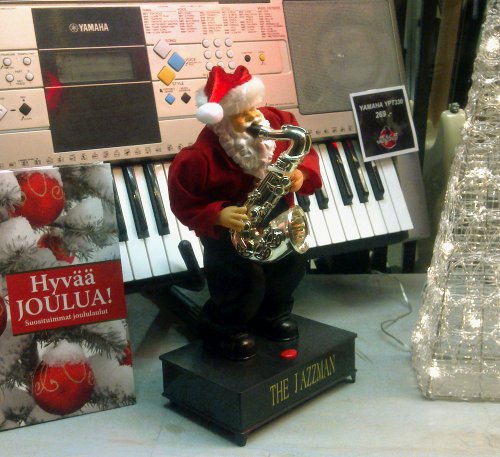 Musiikkikauppa Musikantti Jyväskylässä on koristanut näyteikkunansa todella jouluisasti. Tässä pieni yksityiskohta saksofonia soittavasta joulupukista Hyvää Joulua- laulukirjan nuotteja sovitellen, ehkä.